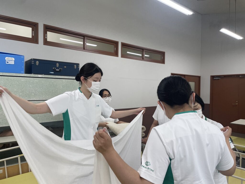 看護学科1年生 ベッドメイキング演習