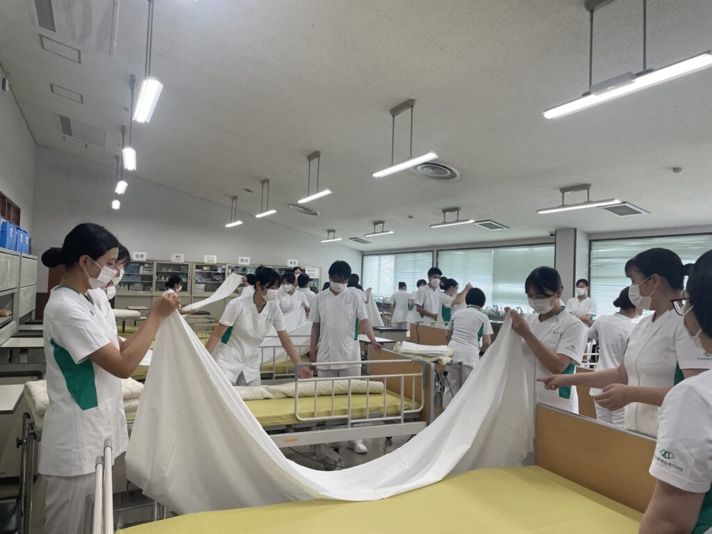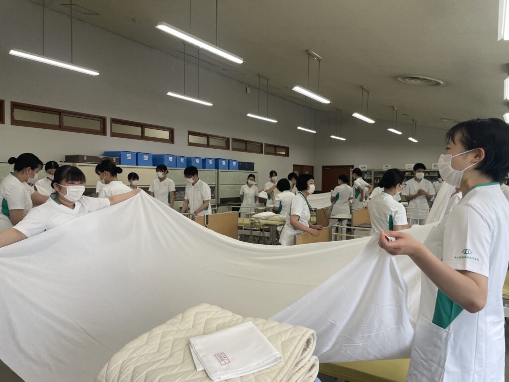 看護学科1年生のベッドメイキングの演習が本格的にスタートしています。