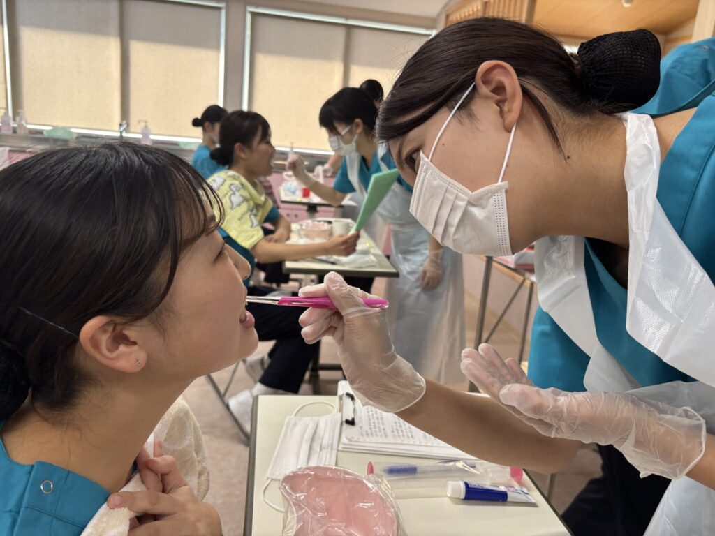 反対のブースでは、口腔ケアの演習です。口の中を見られる羞恥心や感染対策・患者様のADLに応じた援助方法など習得する看護技術は盛り沢山です。