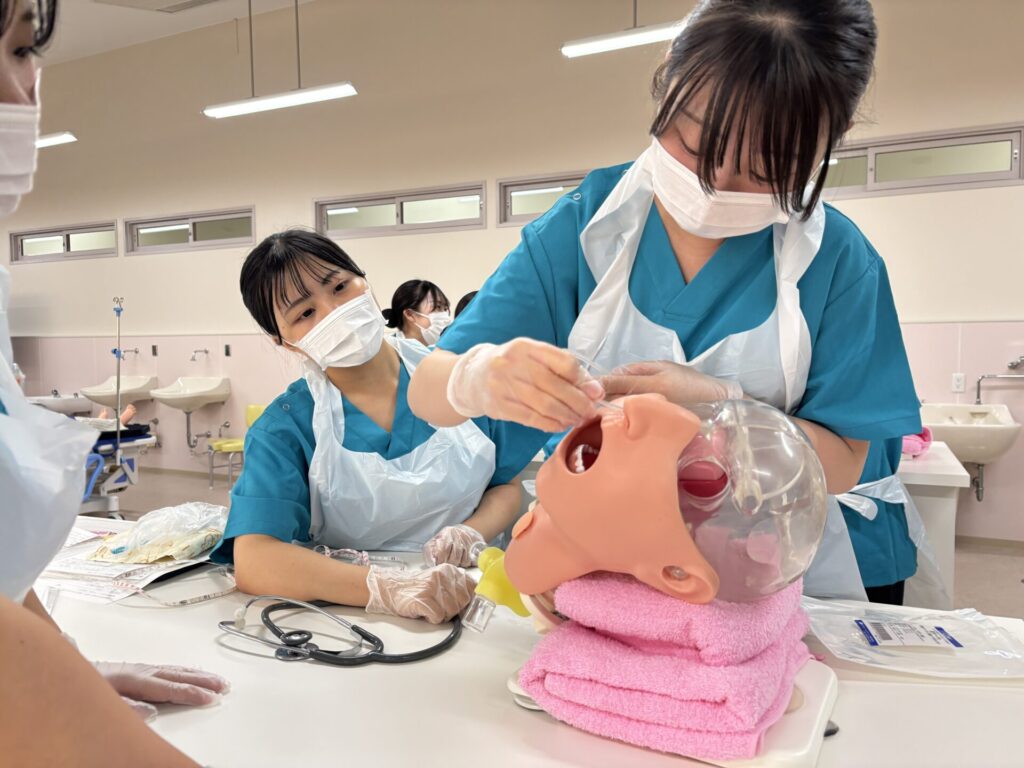 看護学科1年生の「経鼻頸管カテーテル挿入」・「口腔ケア」の演習です。