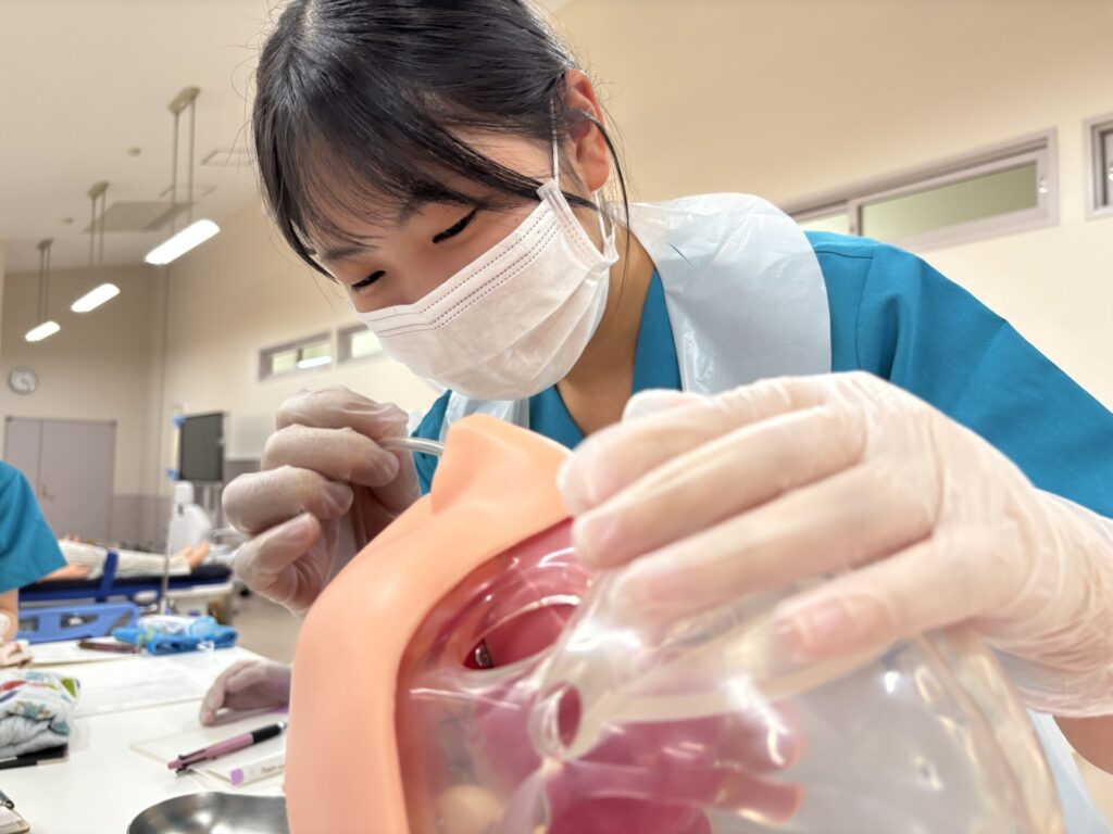 「鼻から管を入れるなんて…怖い…」演習をする学生の本音が聞こえて来ました。