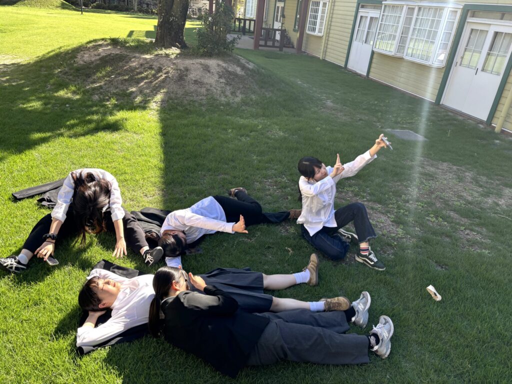 緑の学び舎を満喫している学生達を発見しました。