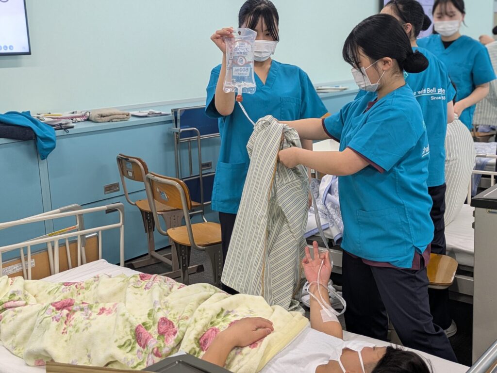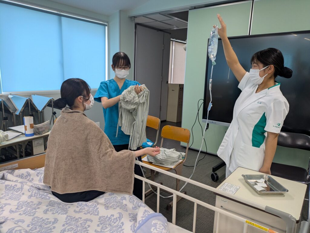 看護学科1年生、点滴実施中の患者様への寝衣交換の演習を行い基礎看護技術もレベルUPしてきました。