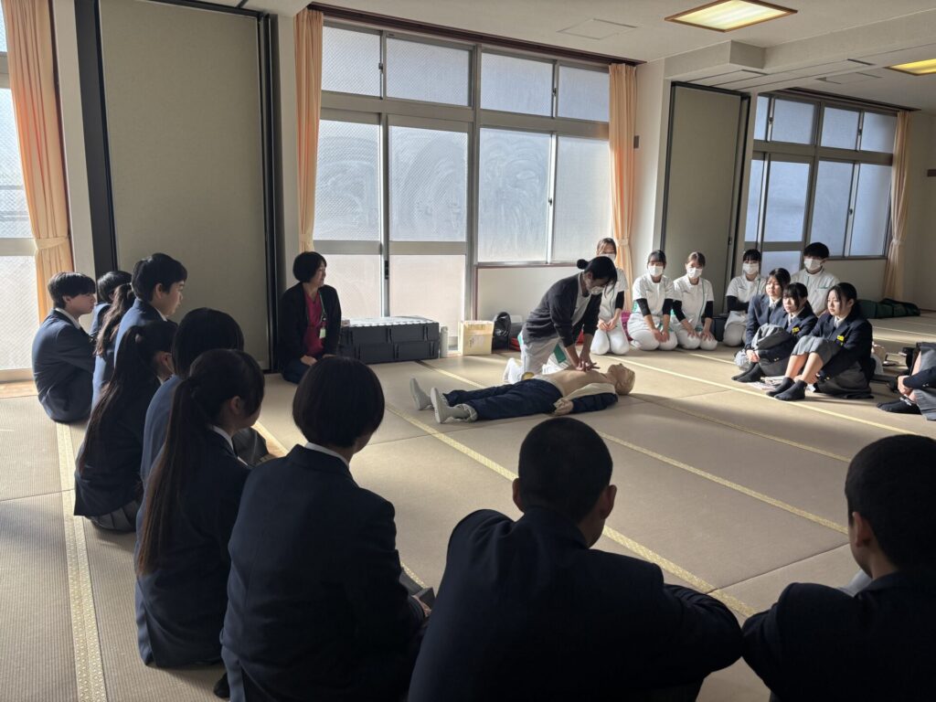 先日、本校看護学科の学生達が岡山東商業高等学校1年生の生徒の皆さんに「心肺蘇生法」の出前授業を行いました。