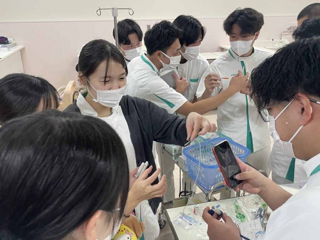 学生達は机上の学びだけでなく、これまでの技術を磨いてきた演習室に集まり、実際の物品を手に取りながら一つひとつの手順や根拠を確認しました。