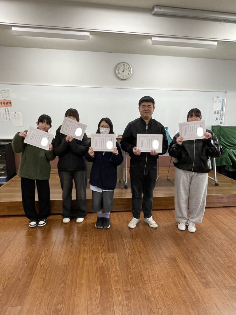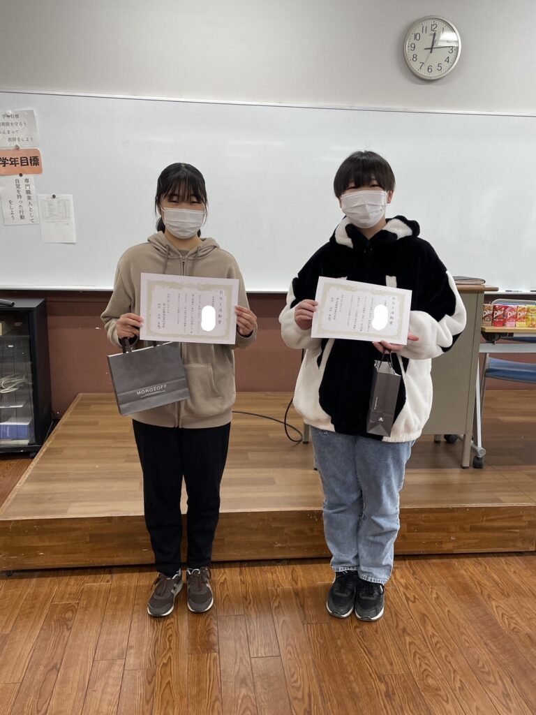本日、介護福祉学科1年生は終業式を行いました。大掃除に始まり、ベルバッチ昇格式、クラス表彰など、1年の締めくくりにふさわしい終業式でした。きれいになった教室で、礼儀や挨拶がよくできていた学生にワンランク上の色のバッチが授与されました。思わぬ昇格に驚きを隠せない学生、昇格を狙っていた学生、様々な学生がクラスメイトの拍手を浴びながらバッチを受け取りました。また、皆勤賞、ボランティア賞、成績優秀賞など1年間の頑張りを表彰されました。学生達は達成感に満ちた笑顔で表彰され、2年生へ向けての意欲を語りました。次はあなた達が先輩ですよ!新1年生を引っ張って行ってくださいね!