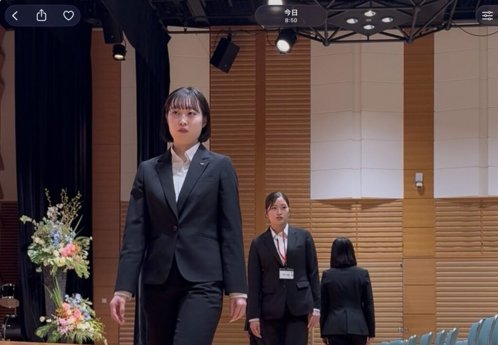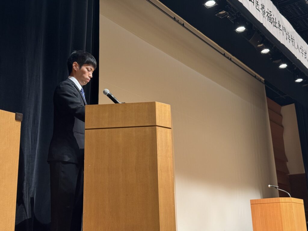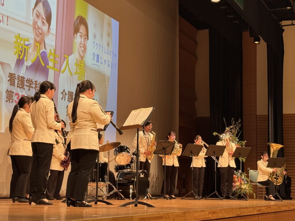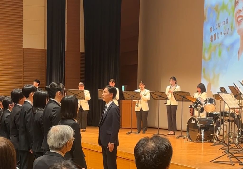本日の新入生入場も在校生が先頭になって入場しました。音楽隊が演奏を奏てくれました。ベルバッチマイスター制度によるベルバッチの表彰も行いました。そして、入学式の司会も看護学科の学生がしてくれました。