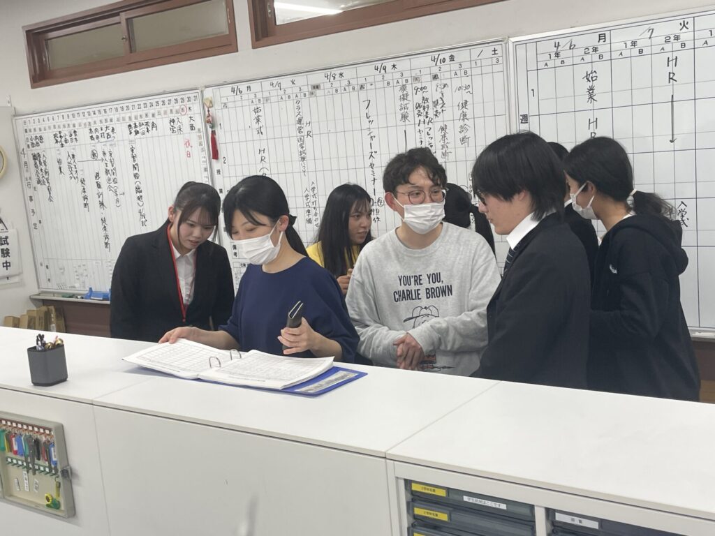 この日は、2年生になったばかりの先輩が校内を案内しながら、教室や実習室の使い方など学校生活におけるルールを説明してくれました。