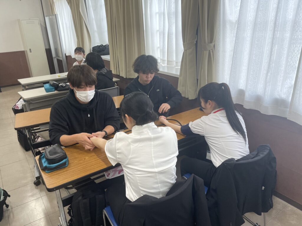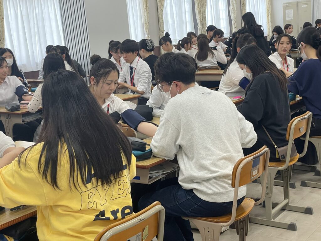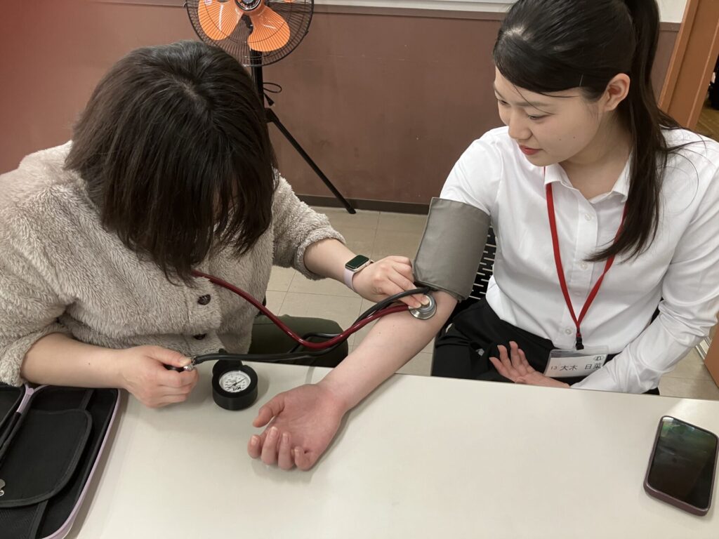 本校看護学科では、健康診断の一環として、2年生が1年生の血圧測定を担当する取り組みを行いました。