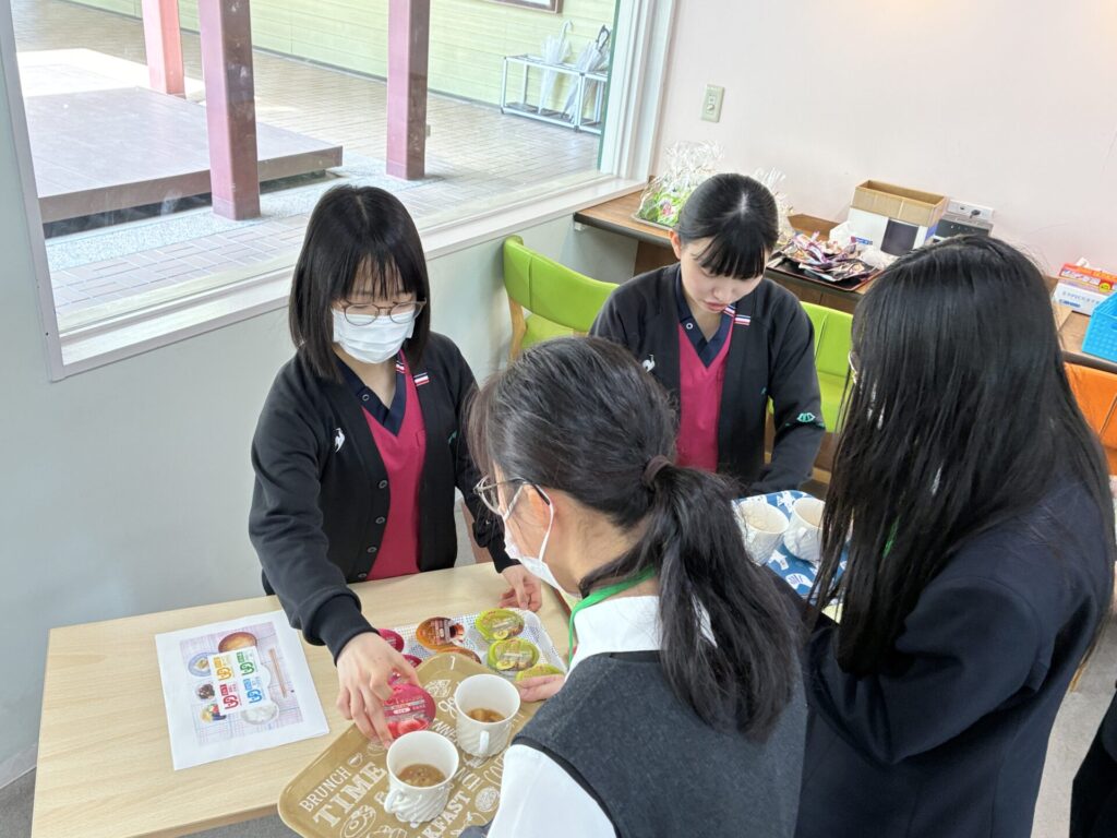また、食事について学ぶコーナーでは「ユニバーサルデザインフード」を紹介、介護食の試食を通じて「誰にとってもやさしい食事」について学んでいました。
