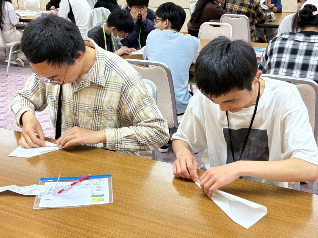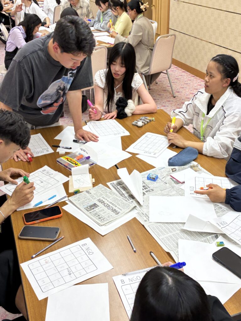 宿泊研修は夜も研修が続きます。豪華な夕食をにぎやかにいただいた後は…「チームビルディング研修」です!気になる内容は…紙飛行機飛ばし大会、画力が試される絵での伝達ゲーム、そしていかに多くの友達のサインをもらうかがカギのBINGO!チームで力を合わせてトライ!