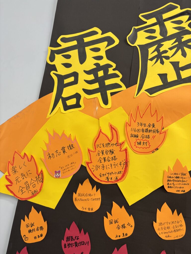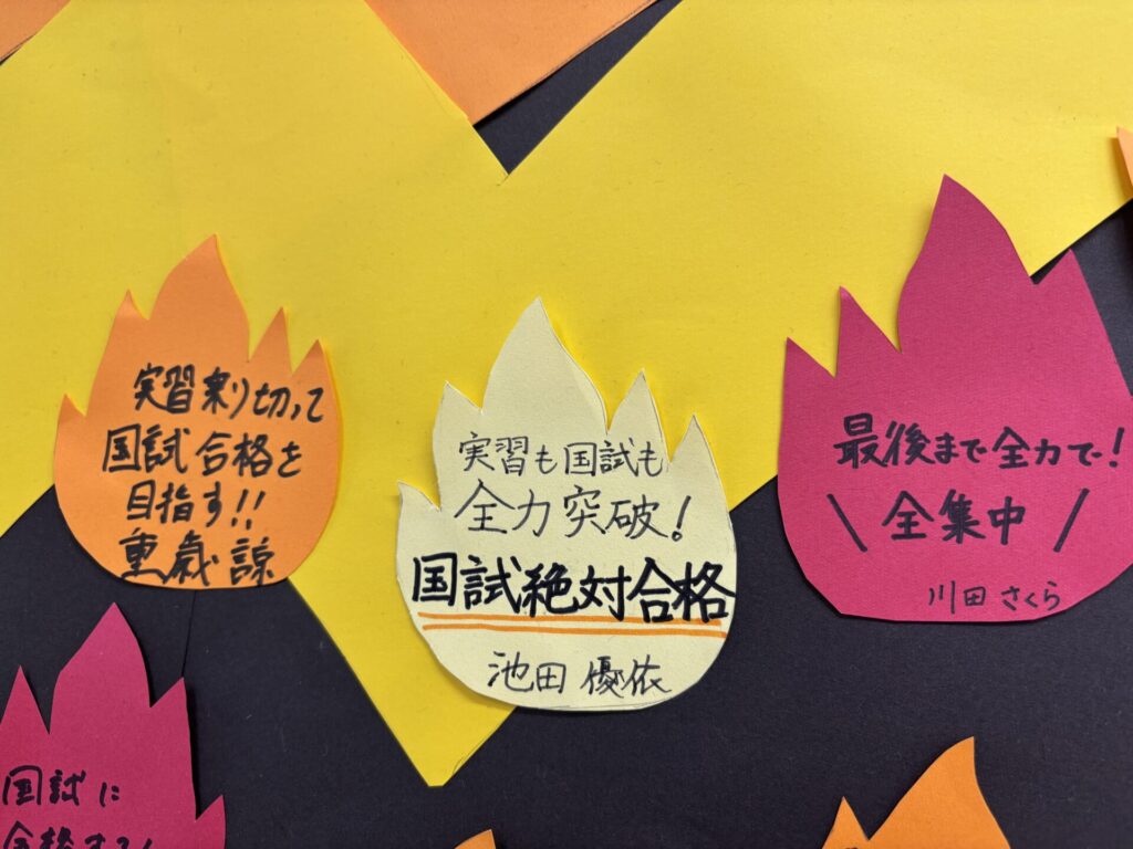 「国家試験絶対合格」「全員で合格したい」「みんなと支え合う」などそれぞれの想いを形にして共有することで、学年全体の士気がさらに高まっています。